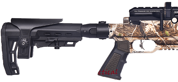 قنداق تفنگ از جنس سنتتیک (فیبر مصنوعی فشرده شده) ساخته شده و قابلیت تاشو بودن و تنظیم طول (تا ۸ سانتیمتر) را داراست. طراحی مدرن و قابلیت جدا شدن آن، همراه با امکان تنظیم قطعه گونه، تجربهای راحت و سفارشی در حمل و استفاده به ارمغان میآورد.